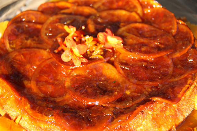 Derreti o açúcar amarelo e a manteiga na forma, dispus as rodelas de laranja e deixei ferver durante o tempo suficiente para libertarem o sumo e este evaporar caramelizando, tal como na tarte tatin.
