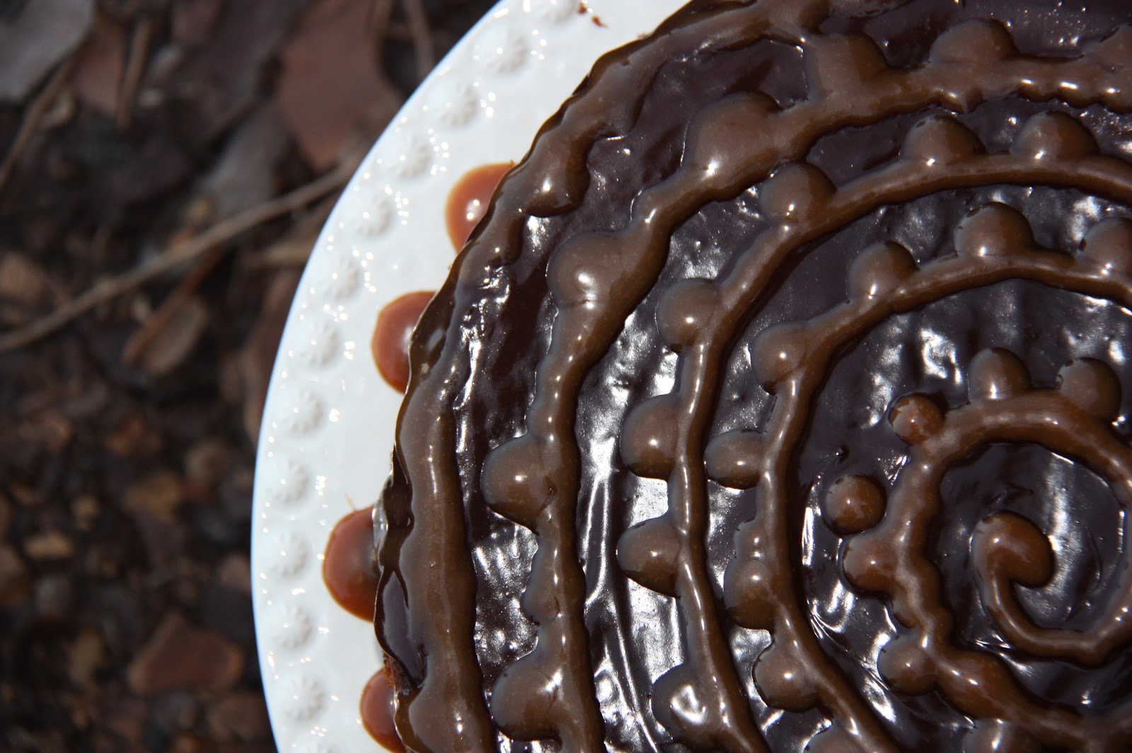 Fiz uma espiral com o caramelo e coloquei gotas ao longo da mesma. Deu-lhe um aspeto parecido com um bordado.