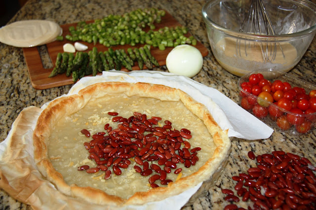 Colocar a massa folhada numa forma para tarte, usando o papel vegetal que a acondiciona para forrar a tarteira. Preencher o fundo com feijão seco (ou outro grão) e levar ao forno alguns minutos até que comece a dourar. Retirar do forno e tirar o feijão do fundo, desta forma a massa folhada vai ficar estaladiça. Pode-se guardar o feijão num frasco para novas utilizações do género.