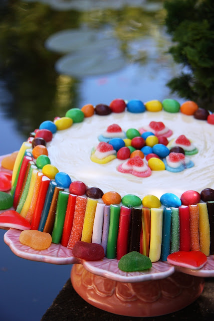 Sabia que queria fazer um bolo decorado com gomas e bem colorido.