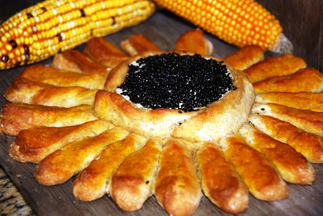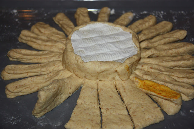 Uma agradável forma de apresentar um pãozinho que se vai desfolhando e mergulhando as pétalas no queijo derretido. A ideia da forma deste pão vi-a AQUI. Devia ter deixado a massa mais espessa, estendi demasiado fina e não ficou tão bonitinho... fica para a próxima vez.